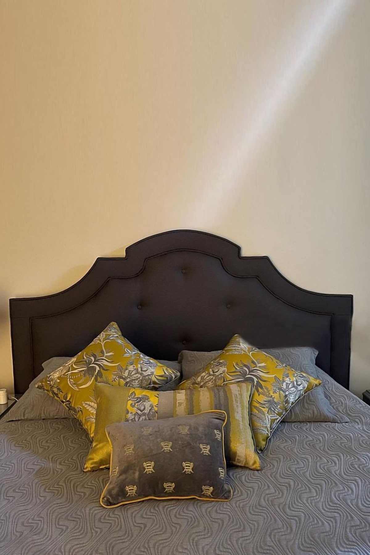 An elegant dark brown upholstered bed with a gracefully arched headboard and button-tufted detailing. It exudes sophistication and classic charm.