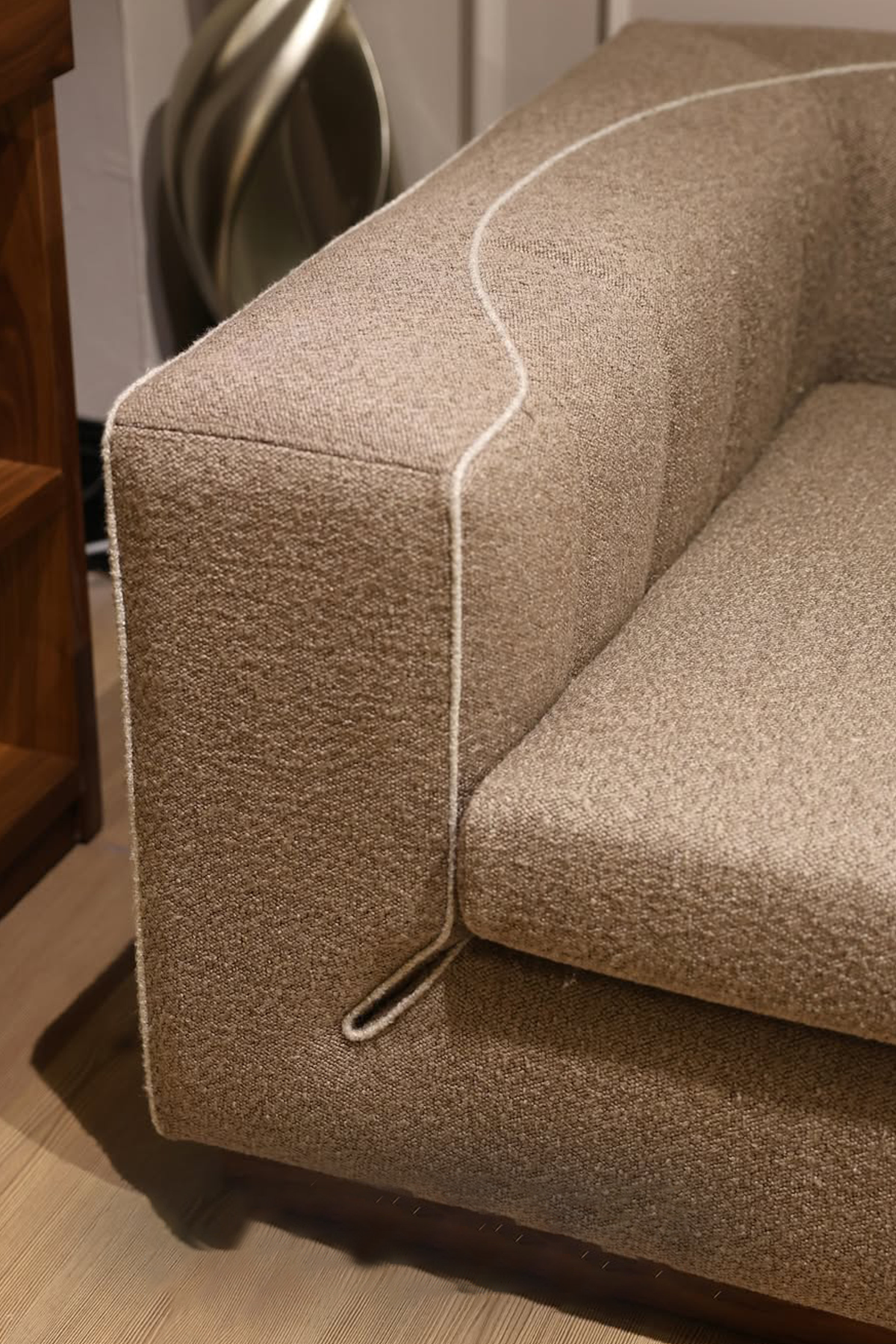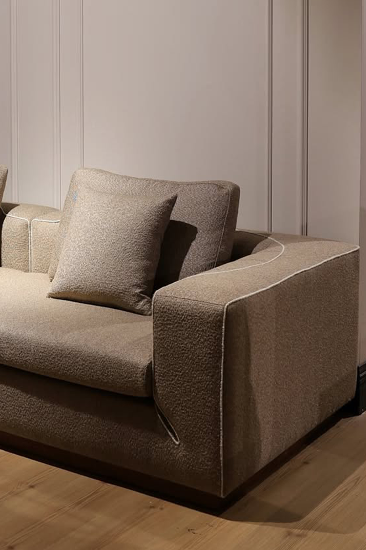 This beige sofa features a sophisticated modern seat design that adds a modern touch to any living room. Crafted for both comfort and style, its neutral tone complements diverse decor, while the unique cut enhances visual interest without compromising on support. Ideal for creating a refined and cozy seating area.