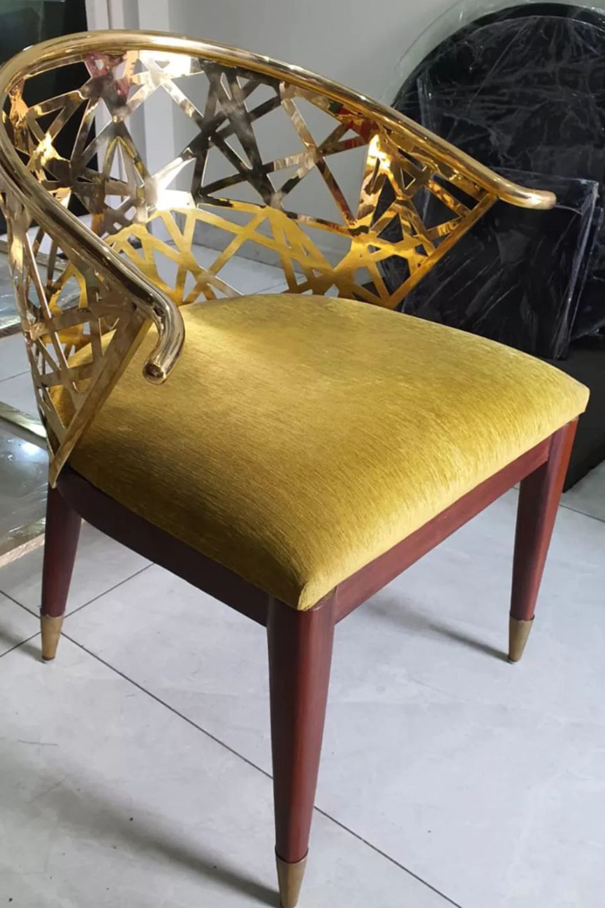 This chair epitomizes elegance and luxury. The bold fusion of gold and green, complemented by the wooden legs, creates a visually captivating contrast. Its modern aesthetic is accentuated by the sleek metal frame, seamlessly intertwining contemporary allure with classic sophistication.