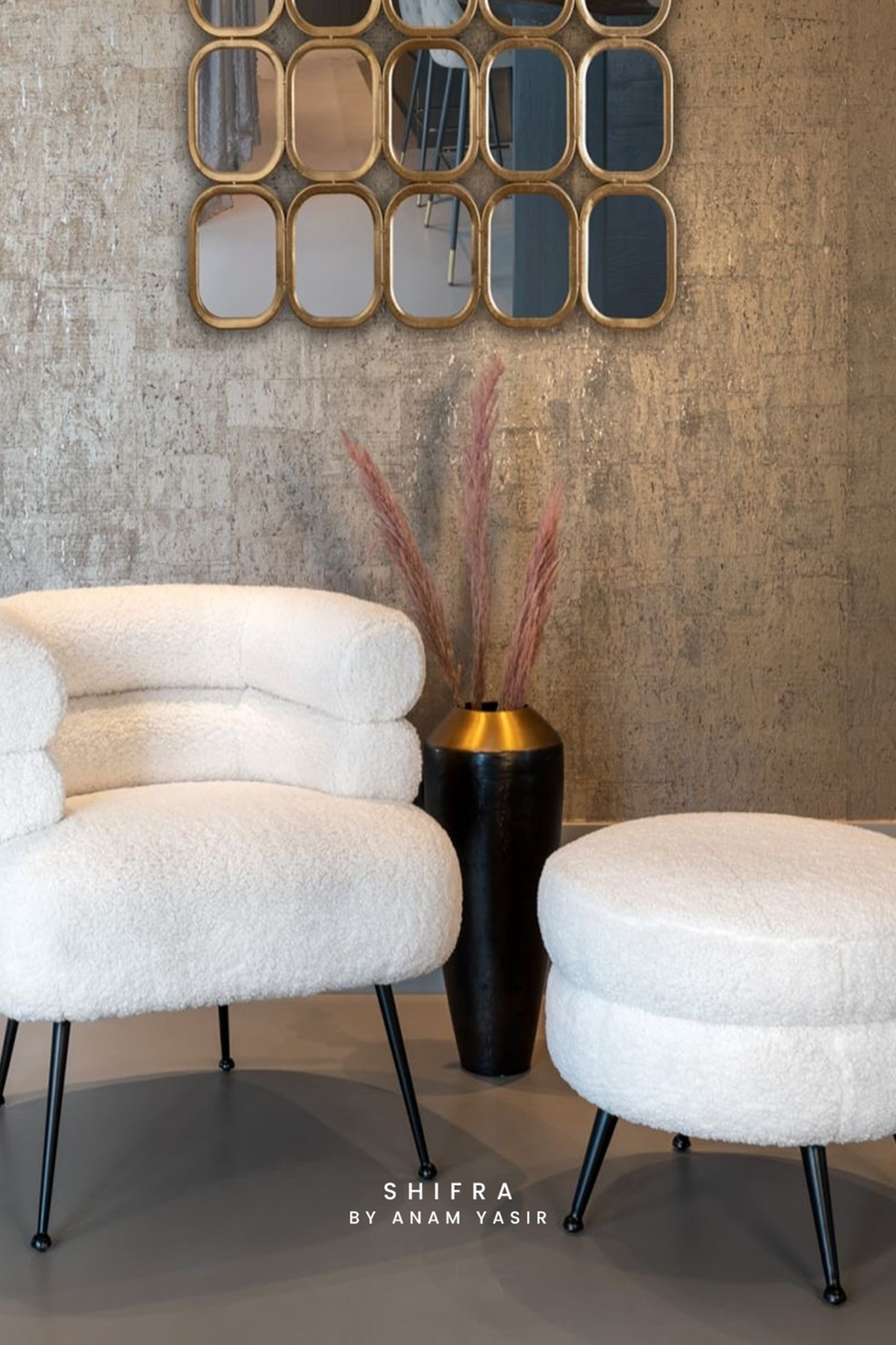 A cozy and stylish chair and stool pair featuring plush white bouclé upholstery and sleek black metal legs. This minimalist set brings a perfect balance of comfort and contemporary design.