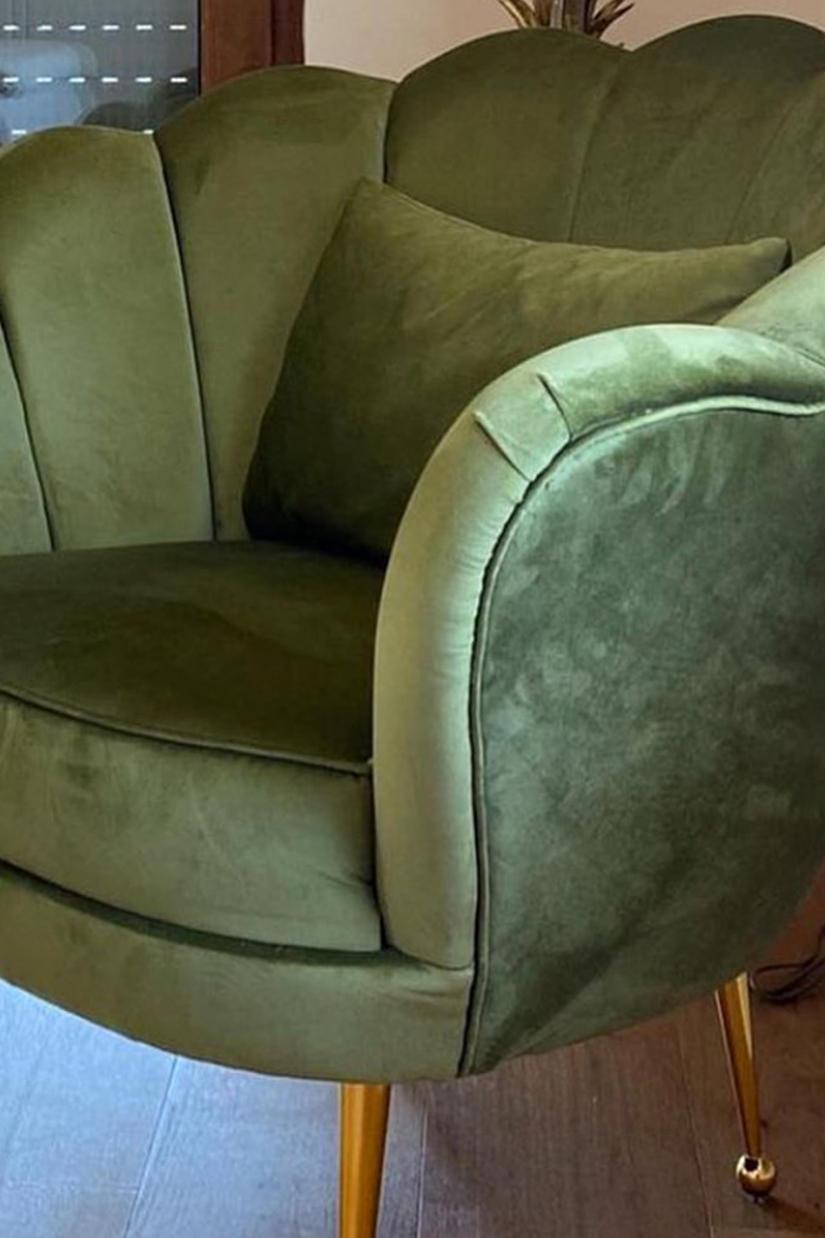 This olive green round sofa features a delicate lined pattern. The gold arrow foot makes it perfect. This masterpiece is the addition you need in your living space!