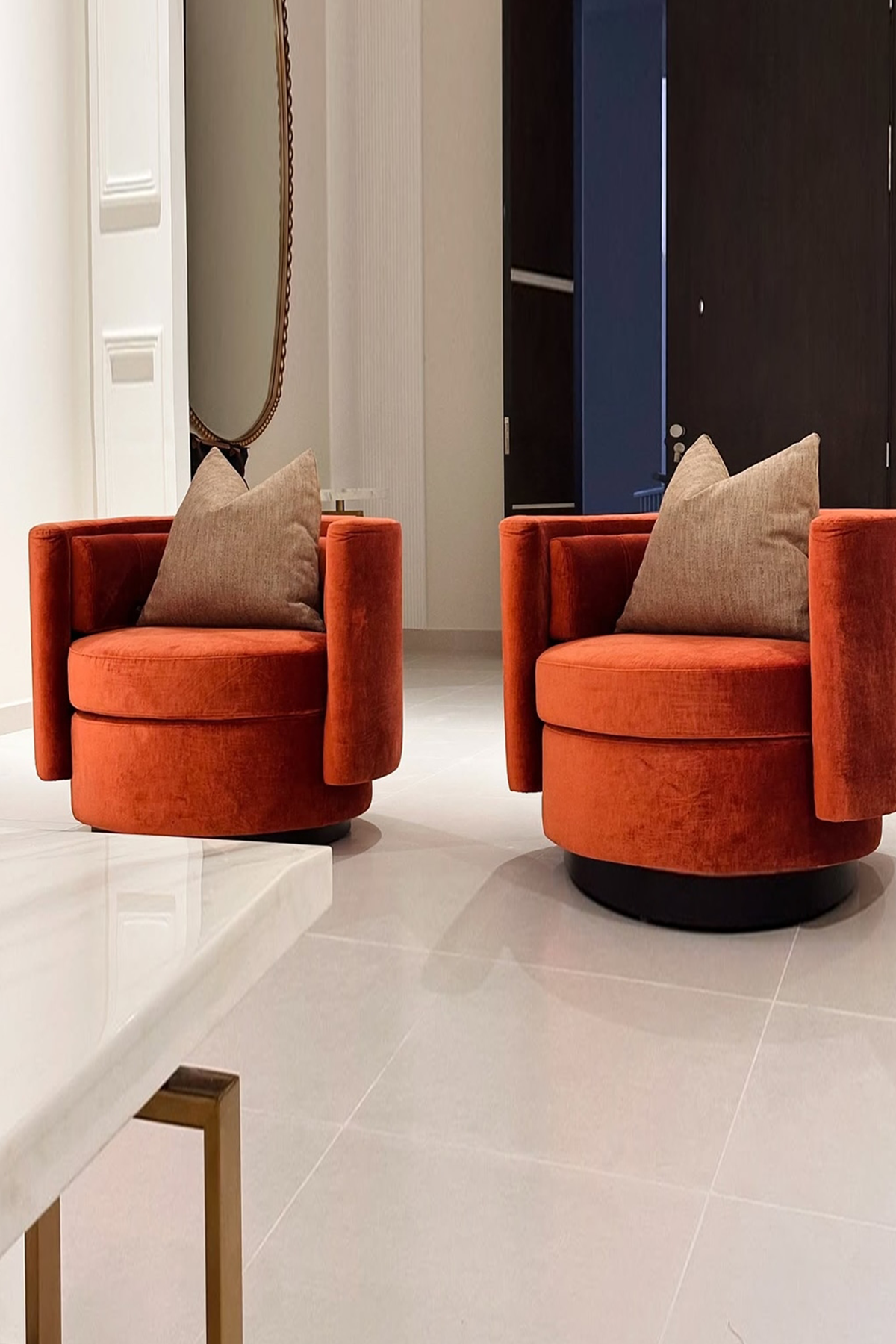 This bold orange chair and stool set combines plush velvet upholstery with a clean, rounded silhouette, offering both comfort and a vibrant touch to any room. Its rich color and modern design make it a standout piece for those looking to elevate their space with warmth and style.