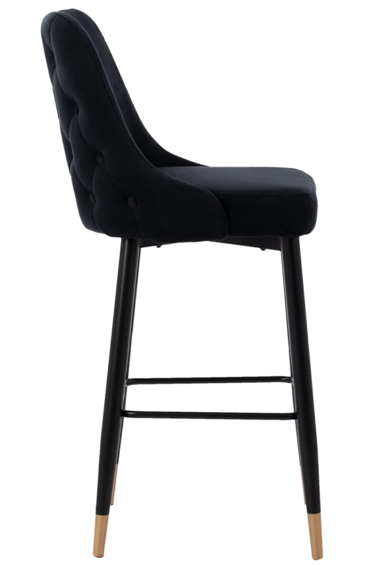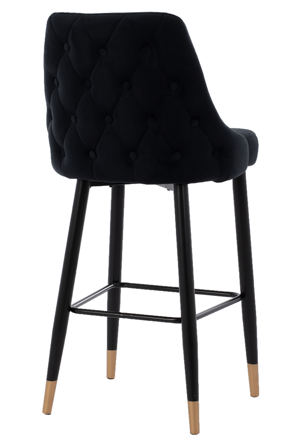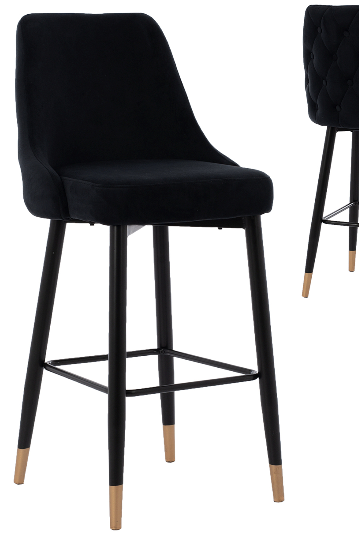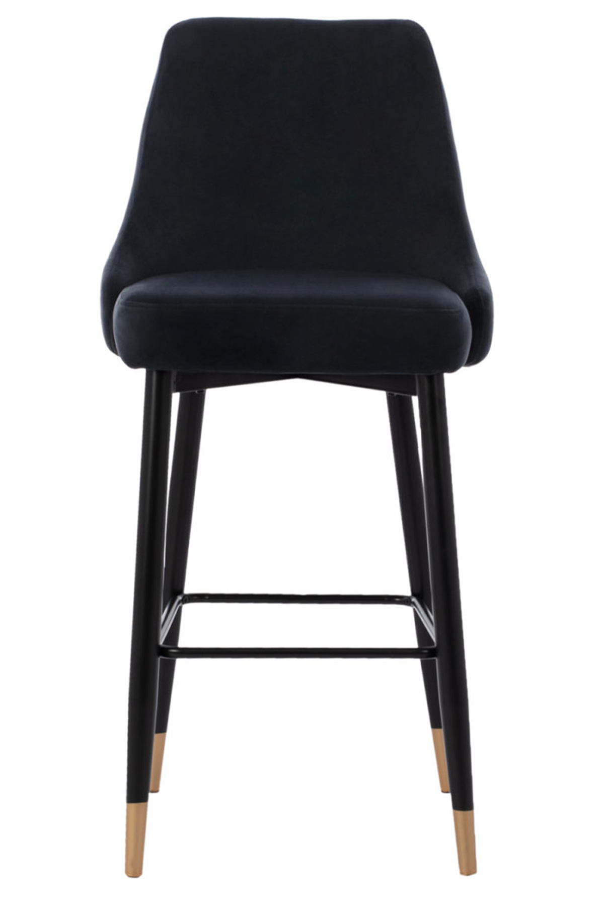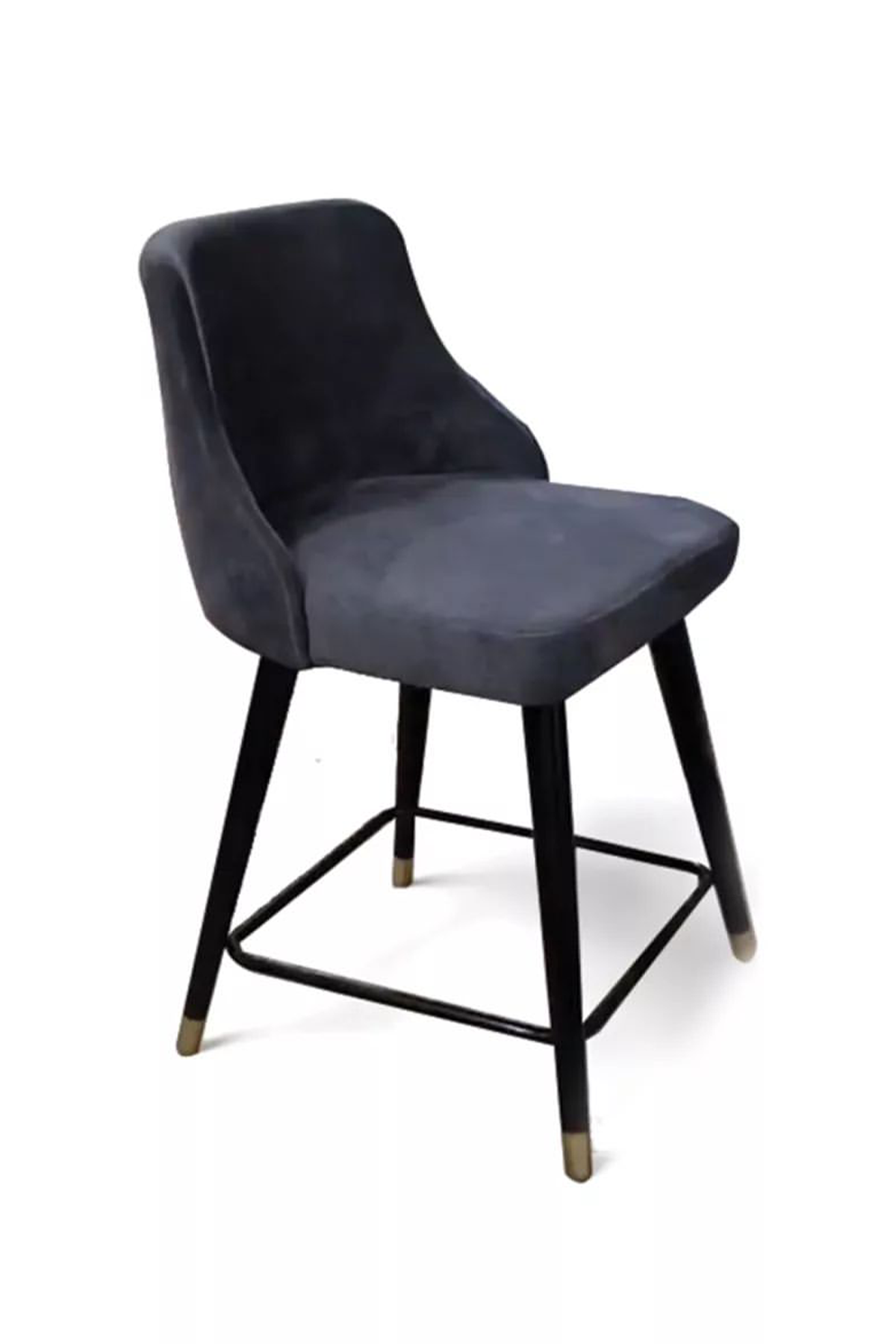This bar stool has black legs and a grey upholstered seat, combining sleekness with comfort. Its minimalist design and neutral colors make it a versatile addition to any modern space.