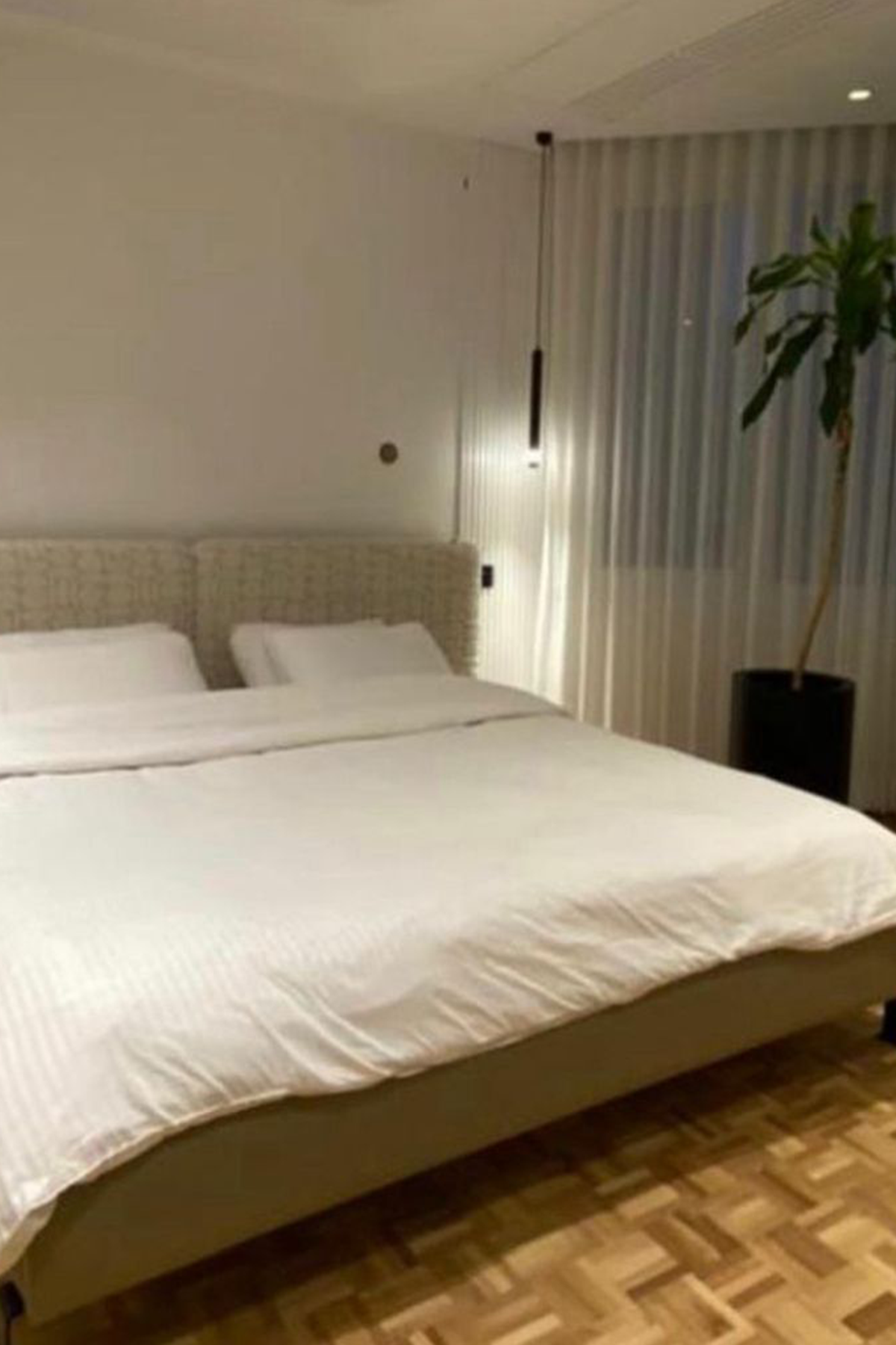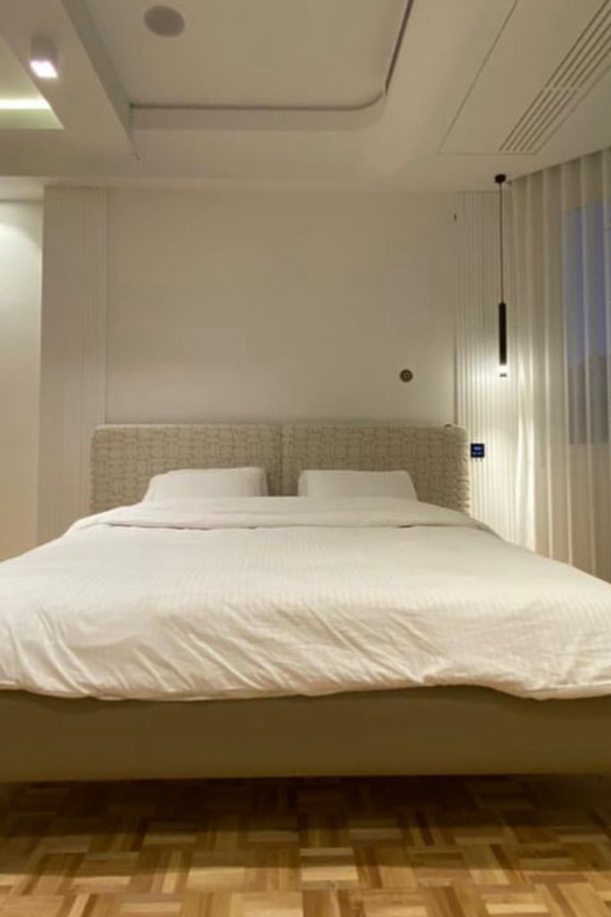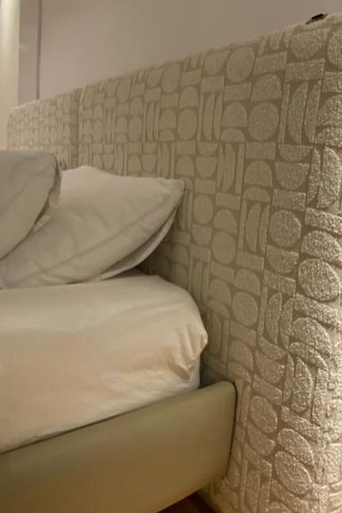 The bed is modern and stylish, featuring a beige color scheme with a fabric back. The design exudes a contemporary aesthetic, combining a neutral tone with a sleek fabric finish for a sophisticated look. This bed likely offers a blend of comfort and chic design elements, making it a versatile and appealing choice for a modern living space.