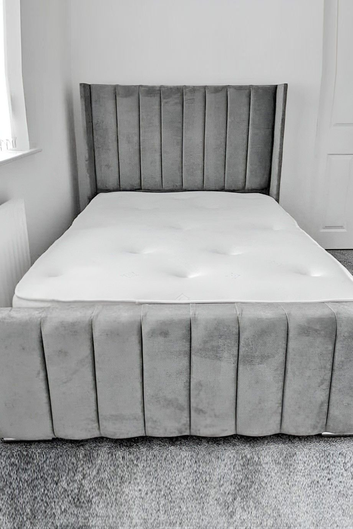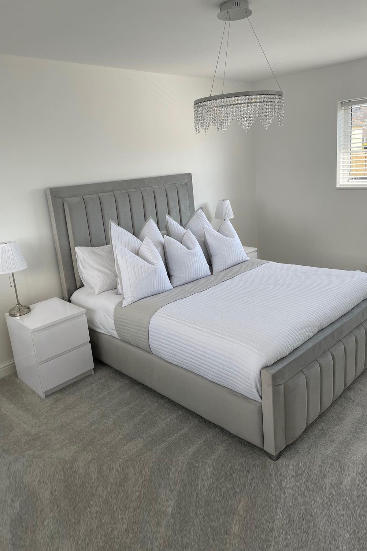 Luxurious, with grey velvet enveloping both front and back, elevating your bedroom with elegance and comfort.