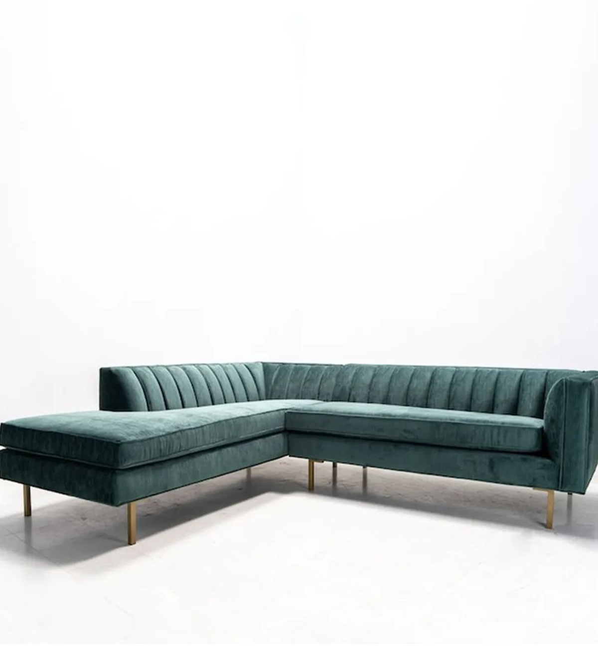 This chic L shaped futon sofa will freshen up your living space with its subtle jade hue and stylish detailing on the back. The minimal brass legs give it a sleek and refined look!